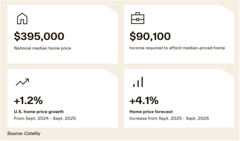 (2025年9月、住宅中間価格、中間価格物件を購入するのに必要な年収、過去1年間の住宅価格変動、 今後1年間の変動)